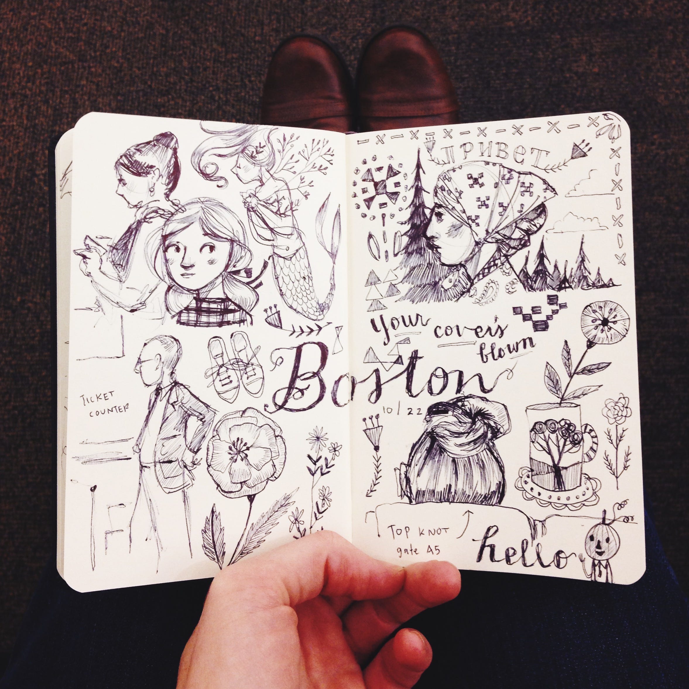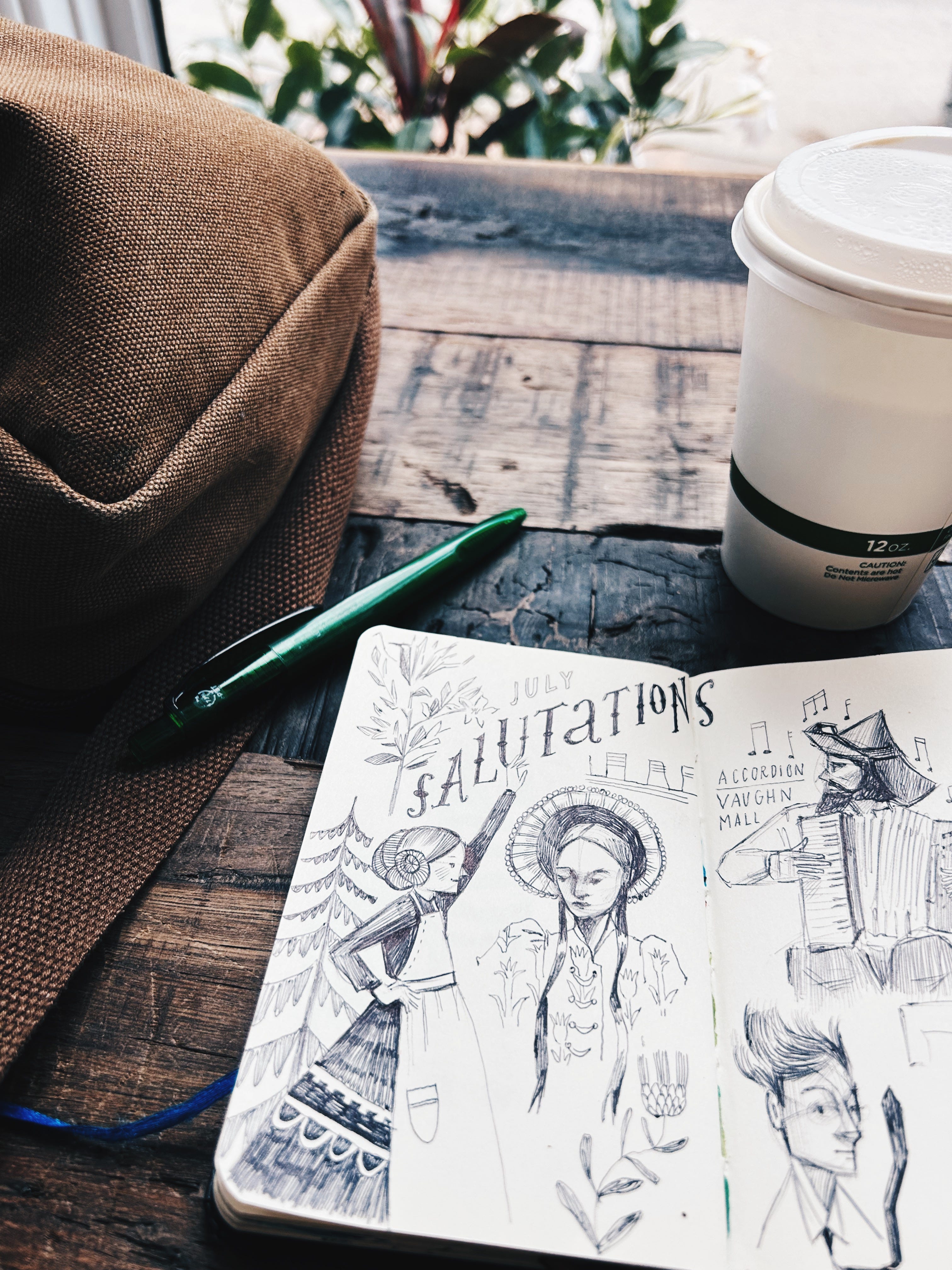 Keep it simple: While I do love taking a travel paint kit on the road, if I’m sketching in a coffee shop or in a waiting room, I tend to keep things pretty basic. Most of the time, I’ll stick to a ballpoint pen. Sometimes I’ll add marker. The less variables I have to think about, the easier the process is and in turn, the less self-conscious I’m likely to feel. I’ve minimized the possibilities, making the process feel more predictable and comfortable.